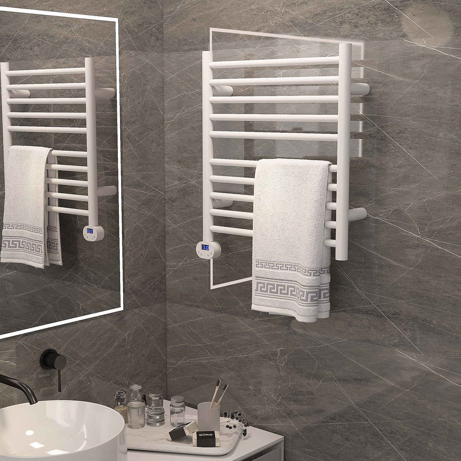 10桿mini開關電熱毛巾架 10 bar mini switch heated towel rail 材質Material:SS201/SS304 功率Power:220V/130W 表面Surface:White Painted 白色噴塑 尺寸Size:500*110*550mm 包裝Ctn size:550*110*650mm