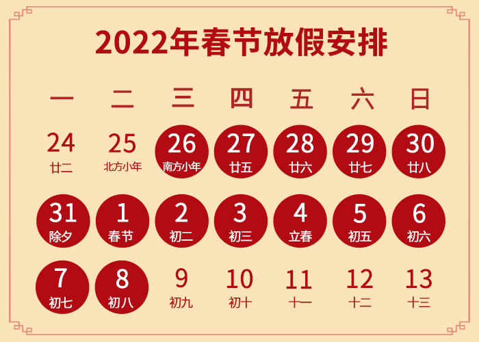 1月26日(臘月二十廿四)至2月8日(正月初八)放假調(diào)休,共14天,2月9日(正月初九)恢復(fù)正常上班。如有任何問(wèn)題,請(qǐng)及時(shí)與對(duì)接業(yè)務(wù)員聯(lián)系。